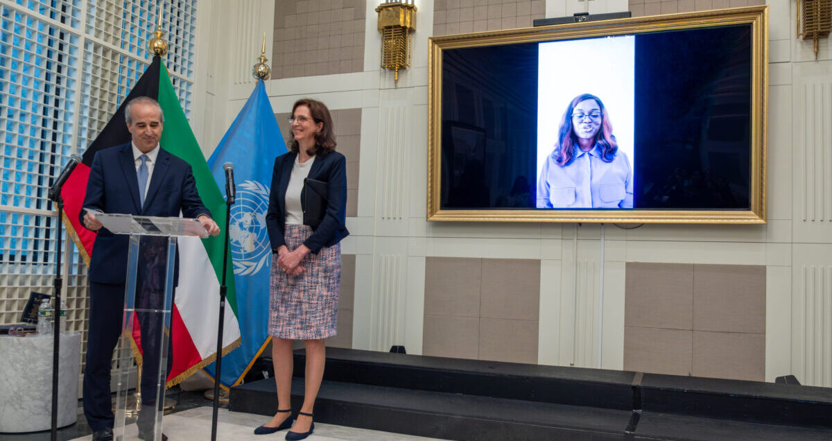 Elizeu Chaves, UN Youth Junior Chief of Staff and Antoinette Merrilees, WIF Vice-President,  announce the 2025 Youth Award winner, Oluwaseun Ayodeji Osowobi at the 50th Anniversary Event on October 15, in New York